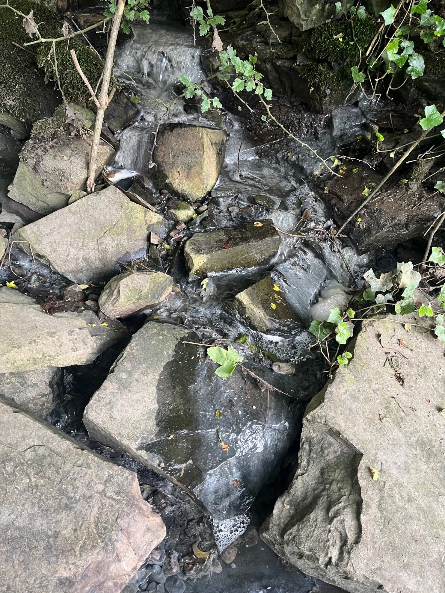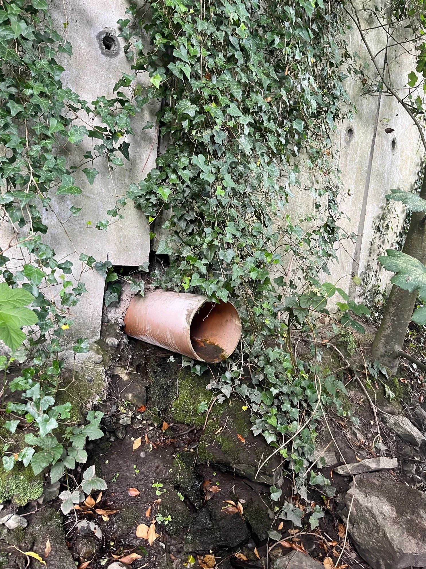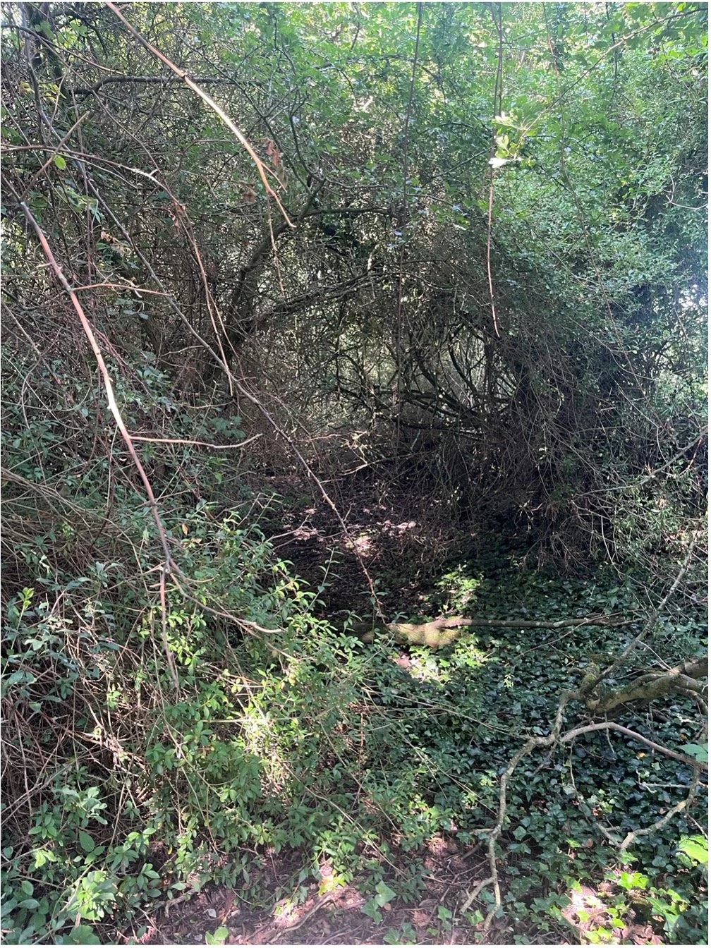 Invasive species, including Himalayan Balsam (Impatiens glandulifera), Cherry Laurel (Prunus laurocerasus), Snowberry (Symphoricarpos albus), Dogwood (Cornus spp.), and Old Man’s Beard (Clematis vitalba), which threaten native biodiversity and riparian vegetation structure.