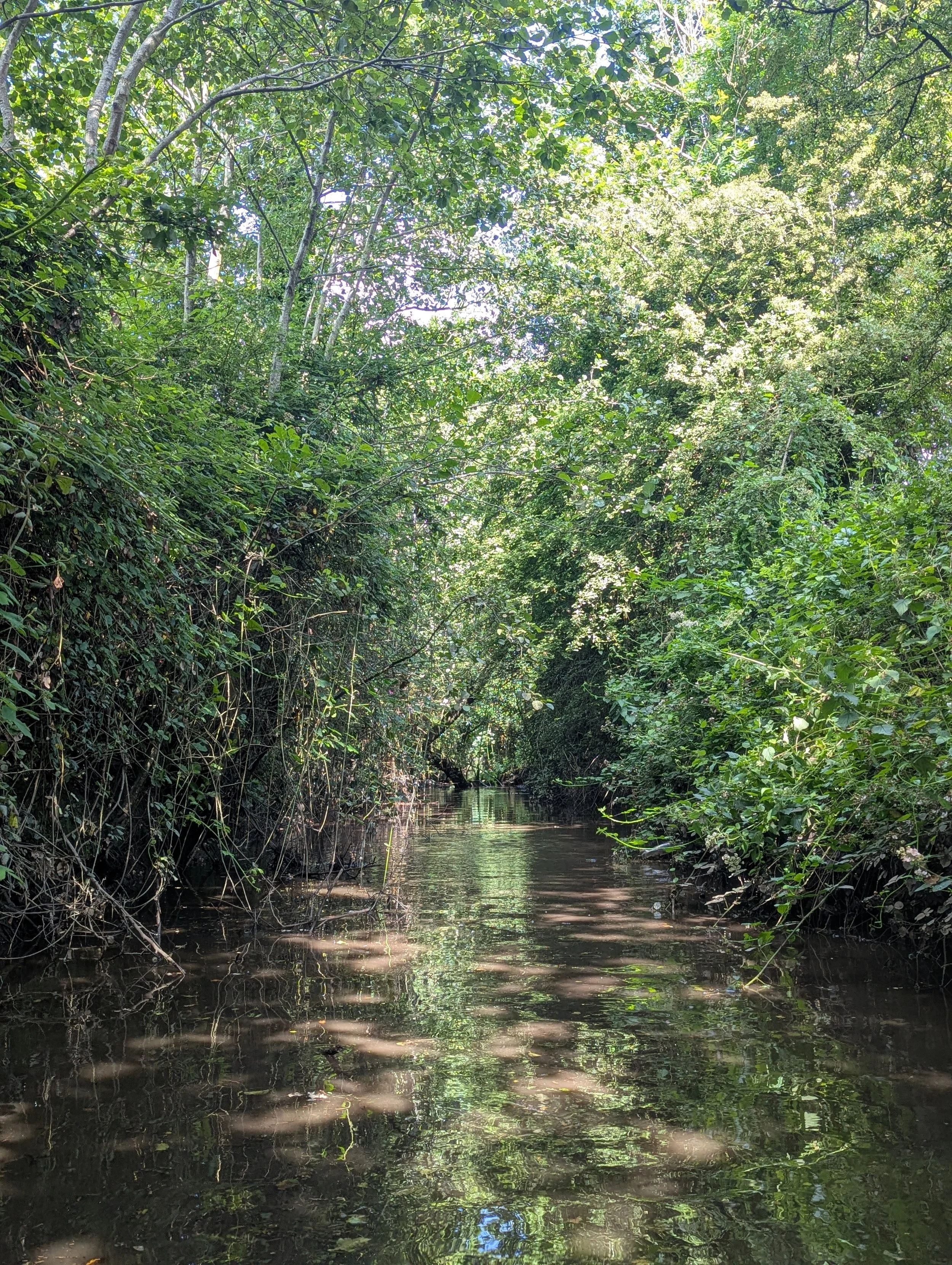 Obstruction of river flow from encroaching overgrown vegetation and man-made barriers accumulating debris and litter.