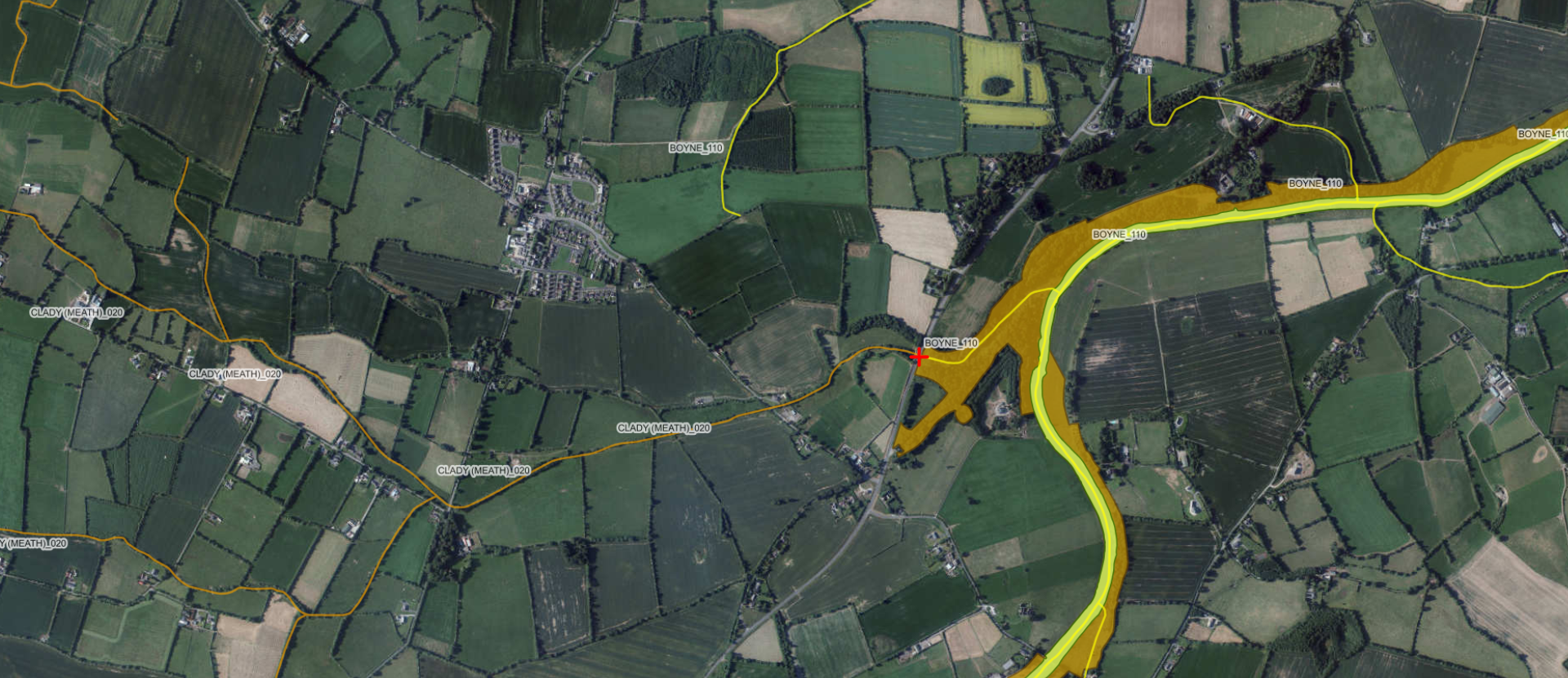 This EPA map indicates at the red ‘+’ symbol where the River Clady joins the Boyne, with the highlighted areas illustrating the SPA in yellow-green and the SAC in orange-brown.